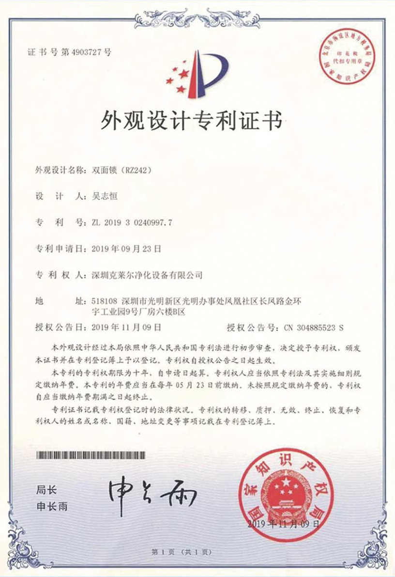 廣東克萊爾潔凈科技有限公司是一家集生產、研發、銷售于一體的專業潔凈門窗生產企業。 公司擁有現代化標準廠房10000多平方米,配備全自動靜電噴涂流水線及 3000平以上萬級無塵生產車間,專供潔凈門及中空窗的生產裝配等。公司不斷引進一流生產設備(如瑞士百超激光切割機、日本AMADA數控折彎機、超聲玻璃清洗機等),采用國際最先進的技術及裝備確保產品品質,是華南區域最具規模的專業潔凈鋼制門及中空潔凈窗生產廠家。公司在同行業率先通過ISO9001質量體系認證,并先后獲得多項專利認證及榮譽證書。 KLE purification equipment Co., Ltd. is a set of production, research and development, sales in one of the professional clean doors and windows production enterprises.The company has a modern standard workshop of more than 10000 square meters, equipped with automatic electrostatic spraying line and more than 30 million level dust-free production workshop, specially for the production and assembly of clean doors and hollow windows. The company constantly introduces first-class production equipment (such as Swiss Baichao laser cutting machine, Japanese AMADA CNC bending machine...